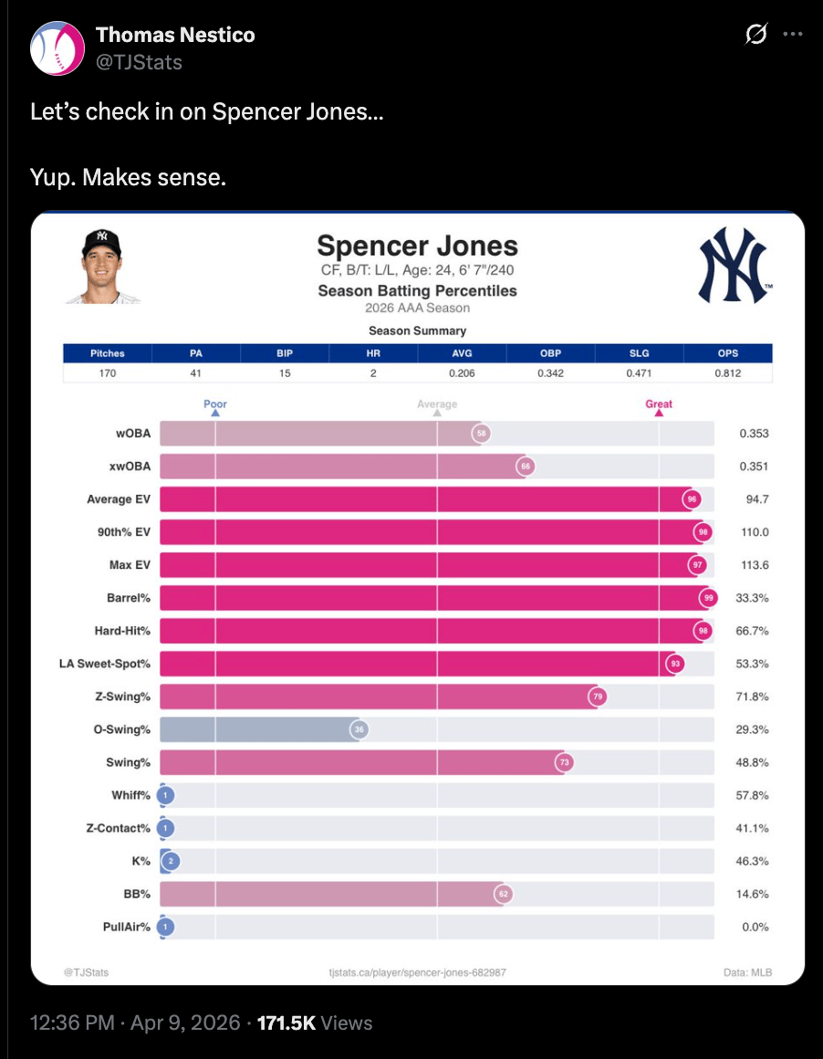 I was doing some prep for a prospects piece I am considering running next week and holy shit… Yankees prospect Spencer Jones is something else