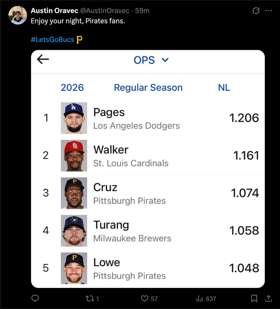 The Pirates have not one, but TWO of the top 5 OPS leaders in the National League.